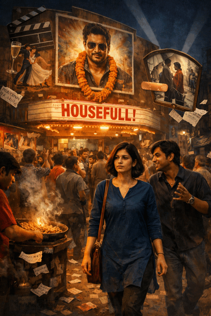 সন্ধে সাতটা। দক্ষিণ কলকাতার একটা পুরনো সিঙ্গল স্ক্রিন হলের সামনে বিশাল ভিড়। পোস্টারে নায়কের গলায় গাঁদা ফুলের মালা ঝুলছে। সবে একটা শো ভেঙেছে, বোঝাই যাচ্ছে হাউসফুল গেছে। লোকেদের উচ্ছ্বাস আর ভাজা বাদাম বিক্রেতাদের হাঁকডাক ডিঙিয়ে, হেঁটে আসছে নীলা।