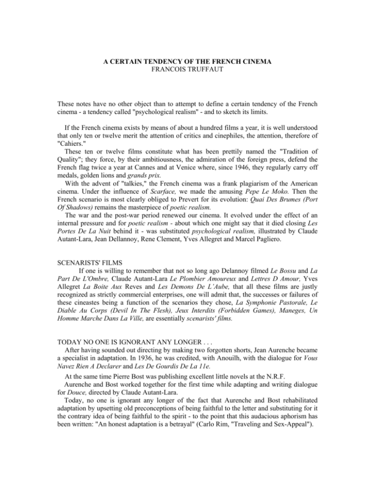‘কাহিয়ের দ্যু সিনেমা’-তে ১৯৫৪-তে ‘A Certain Tendency of the French Cinema’-তে ত্রুফো তৎকালীন ফরাসি ছবির সম্বন্ধে যে অভিযোগগুলো করছেন, তার একটা বড় দিক হল—
