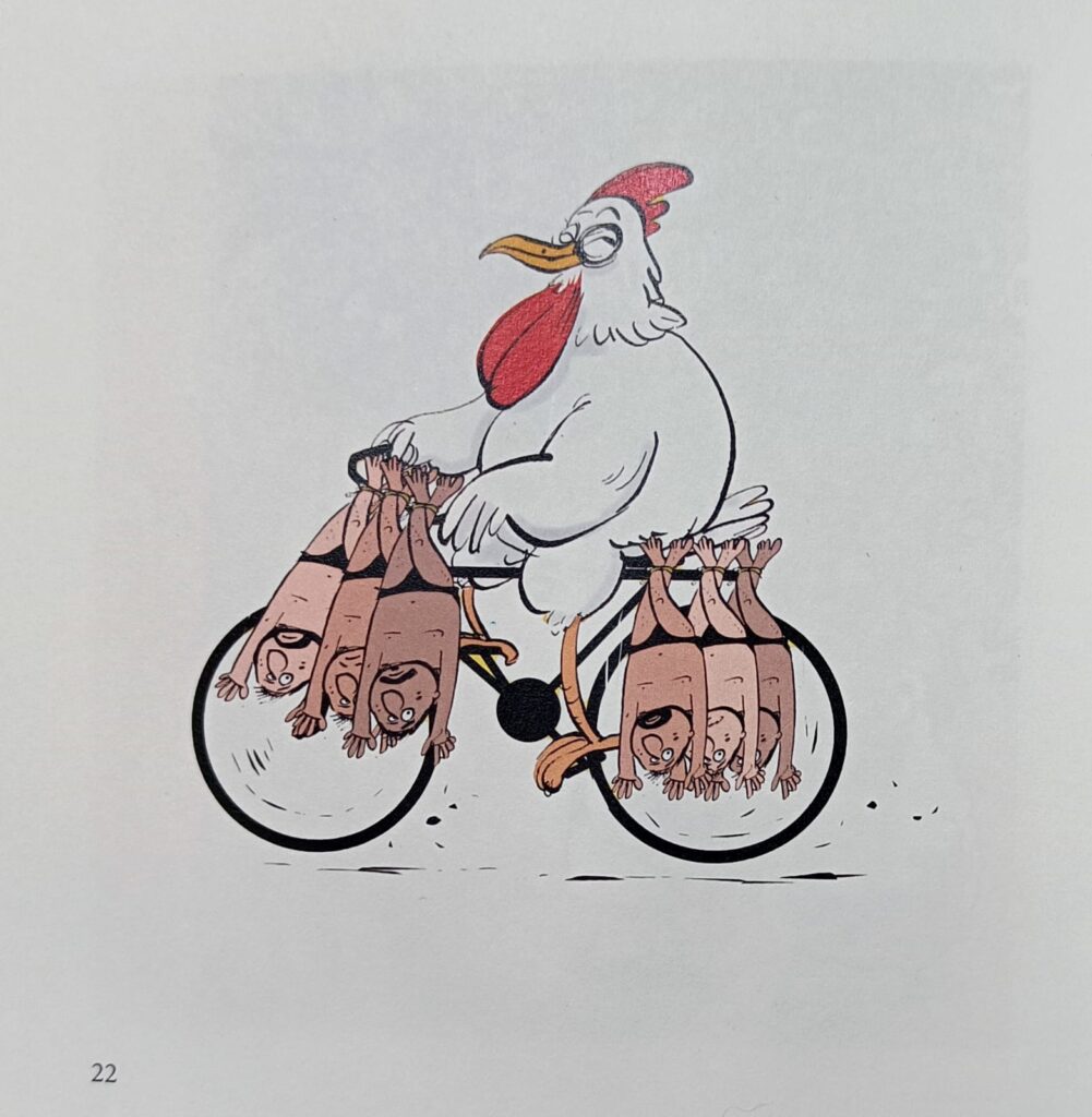 এই বইয়ের পঁচিশটি ছবির মধ্যে আমার সবচেয়ে প্রিয় ছবি কোনটি? আমার বিচারে যে ছবিটি সবচেয়ে অস্বস্তিকর, সেইটিই। বইয়ের ঠিক মাঝামাঝি, বারো নম্বরে, দেখতে পাই, এক মুরগি সাইকেলে করে চলেছে, তার হ্যান্ডেল থেকে ক্যারিয়ার থেকে ঝুলছে পায়ে দড়ি বাঁধা উল্টো করে টাঙানো একগুচ্ছ মানুষ! বাকি চব্বিশটি ছবিতে অল্প কিছু সংলাপ বা শব্দ ব্যবহার করা হয়েছে, একমাত্র এই ছবিটি শব্দহীন। আমার মতে, তাই, এই ছবিটিই সর্বোচ্চ বাঙ্ময়! জঙ্গলে-থাকা বাঘ সিংহের অধিকারের কথাটা তবু না-হয় শহরজীবী আমরা মেনে নিলাম, কিন্তু মুরগির কি কোনো অধিকার আছে? সে যতদিন বেঁচে আছে তার স্বস্তি-অস্বস্তি নিয়ে মাথা ঘামাবার কোনো দায় কি আমাদের আছে? মাথাটা নীচের দিকে করে ঝুলিয়ে যখন মুরগির দলকে নিয়ে যাওয়া হয়, তখন মাথায় রক্ত নেমে তাদের মাথাটা কেমন-করে ফেটে যাওয়ার দশা হয়, তা নিয়ে কি আমাদের আদৌ ভাবার প্রয়োজন আছে? যে-প্রশ্ন আমাদের দৈনন্দিন স্বার্থের থেকে দূরে তা সহজ প্রশ্ন। যে-প্রশ্ন আমাদের ব্যক্তিগত স্বার্থের পরিসরের মধ্যে ঢুকে পড়ে তা-ই সত্যিকারের কঠিন প্রশ্ন। এই কঠিন প্রশ্নটি করতে পারে এই বিশেষ ছবিটি। এই ছবির কোনও তুলনা নেই। ‘মানুষের ধর্ম’ বইতে রবীন্দ্রনাথ বলেছিলেন মানুষের একটা বড়ো গুণ হচ্ছে যে সে ‘দুঃখভীরু’ নয়, সে নিজেকে ‘আরামের দ্বার ভেঙে’ বাইরে বের করতে জানে, সেইখানেই মানুষের জয়। উদয় দেবের এই ছোট্ট বইটি আমাদের আরামের দ্বারে নাড়া দেয়। এই বইয়ের জয় হোক।