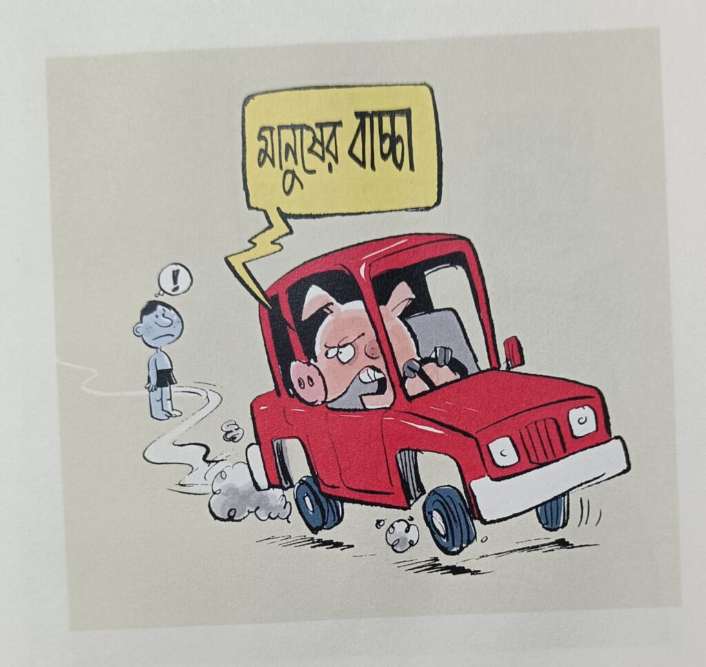 উদয় দেবের এই আশ্চর্য বইটির জোর হল এ তো তত্ত্ব‘কথা’র বই নয়, ছবির বই। ছবি তৈরি করে দৃশ্য, দৃশ্য তৈরি করে মর্মান্তিক অভিঘাত, শব্দের সামর্থ্যকে তা বহুদূরে ছাড়িয়ে যায়। ফলে প্রথম আর্টপ্লেটেই যখন আমরা দেখি গাড়ি চড়ে যাচ্ছে এক শুয়োরছানা আর পথের পাশে দাঁড়ানো এক ভ্যাবাচাকা মানুষ-শিশুর দিকে ছুঁড়ে দিচ্ছে উদ্ধত গালি, ‘মানুষের বাচ্চা’, তখন বুঝতে পারি এ তো ছবি-মাত্র নয়, এ হল এক আয়না। এ ছবি দিয়ে নিজেকে চেনা যায়।