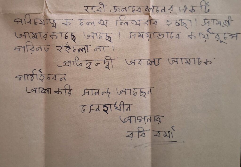 তৃতীয় চিঠিটি রবি বর্মার। তিনি ছিলেন কেরালা থেকে প্রকাশিত হিন্দি পাক্ষিক ‘যুগপ্রভাত’-এর সম্পাদক। চিঠিটি উল্লেখযোগ্য একটিই কারণে। রবি বর্মা বাঙালি নন, কিন্তু সুবিমলকে চিঠি লিখছেন বাংলাতেই। শব্দচয়ন ও অক্ষরের ছাঁদে হিন্দির প্রভাব স্পষ্ট। হস্তাক্ষরও আড়ষ্ট। তারপরও, তাঁর এই প্রচেষ্টা প্রশংসনীয়।
