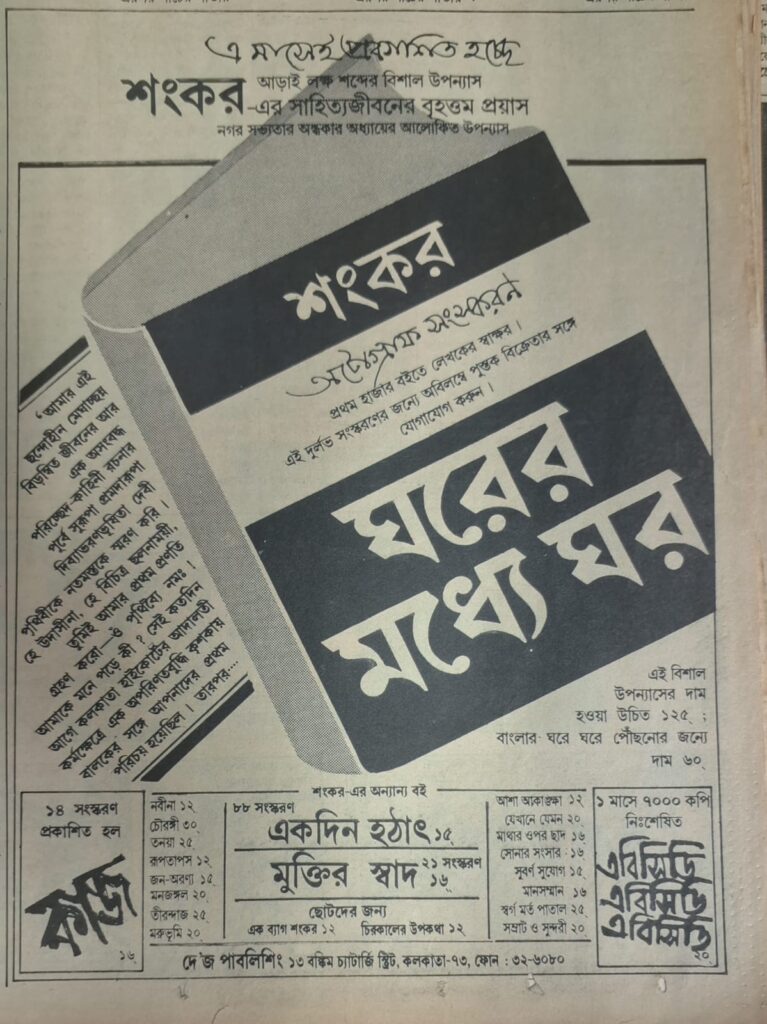 ‘কত অজানারে’ বই হিসেবে প্রকাশিত হওয়ার আগে ‘দেশ’ পত্রিকায় তা ধারাবাহিকভাবে প্রকাশিত হয়। প্রকাশের সময় থেকেই আলোড়ন পড়ে যায় পাঠক-মহলে। একুশ বছরের এক বালক ‘দেশ’ পত্রিকার অফিসে তাঁর পাণ্ডুলিপি জমা দিয়ে আসেন। ‘দেশ’ পত্রিকার সম্পাদক সাগরময় ঘোষ সেই তরুণ লেখক ও তাঁর লেখার ভক্ত হয়ে পড়েন। ‘দেশ’ পত্রিকার দফতরে তখন জমাটি আড্ডার আসর। সেই আড্ডার গল্প শুনেছি শংকরজেঠুর কাছে। কানাই সরকার ছিলেন ওই এবিপি গ্রুপে বিজ্ঞাপনের কর্তাব্যক্তি। সরকারে-সরকারে আত্মীয়তার সম্পর্কের জেরে এবিপি-র কোনও বিভাগ কানাইবাবুকে বিশেষ ঘাঁটাতেন না। শংকরজেঠুর লেখা শেষ হতেই কানাইবাবু নিজের মনেই ঠিক করে রেখেছিলেন, কে প্রকাশক হবেন এই বইয়ের। তিনি রামপদবাবুকে বলেছিলেন শংকরকে ডিএম লাইব্রেরিতে নিয়ে যেতে। শংকর রাজি না হওয়ায় তিন বছর কথা বলেননি কানাইবাবু। ‘দেশ’ পত্রিকায় গুঞ্জন শুরু হয়ে গিয়েছিল শংকরের আর লেখা হবে না এখানে। সাগরময়বাবুও নাকি বলেছিলেন, না চটালেই পারতেন।