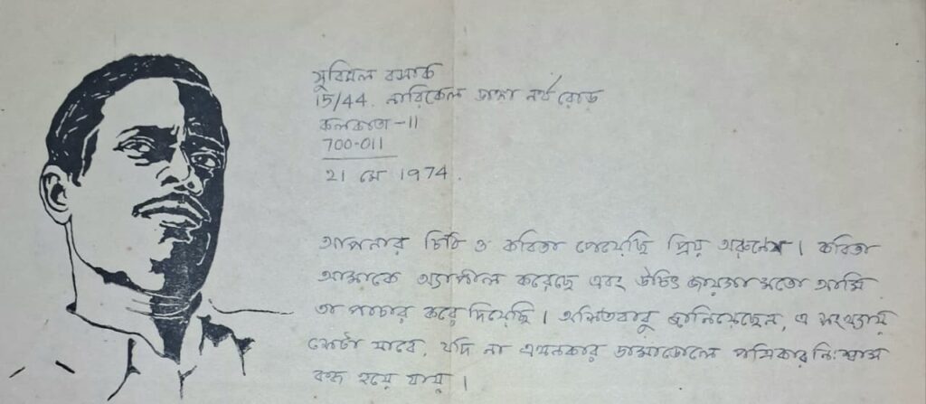 একটা উপকার করবেন বিমল? ৩৬/৫, বেনেটোলা লেন (হরলালদার বাড়ীর পিছন দিকে— কলেজ স্ট্রীটের কাছে) শ্রীবানী প্রিন্টিং কোং— প্রেসের নাম। মালিকের নাম দেবকুমার দে। ১০ (দশটাকা) ওঁকে দিন এবং আমার হয়ে বলবেন সমীর রায়চৌধুরীর কবিতার বইটা এবার ছাপতে শুরু করুন, দ্রুত। আমি সামনের শনিবার সন্ধ্যায় ওঁর সঙ্গে দেখা করছি, আপনিও থাকবেন কফি হাউসের দরজায় ৫।।. নাগাদ। চিঠি পাওয়া মাত্র টাকাটা পৌঁছে দিন, তারপর আমি আপনাকে গিয়ে টাকা দেবো। অনুরোধটা রাখবেন।