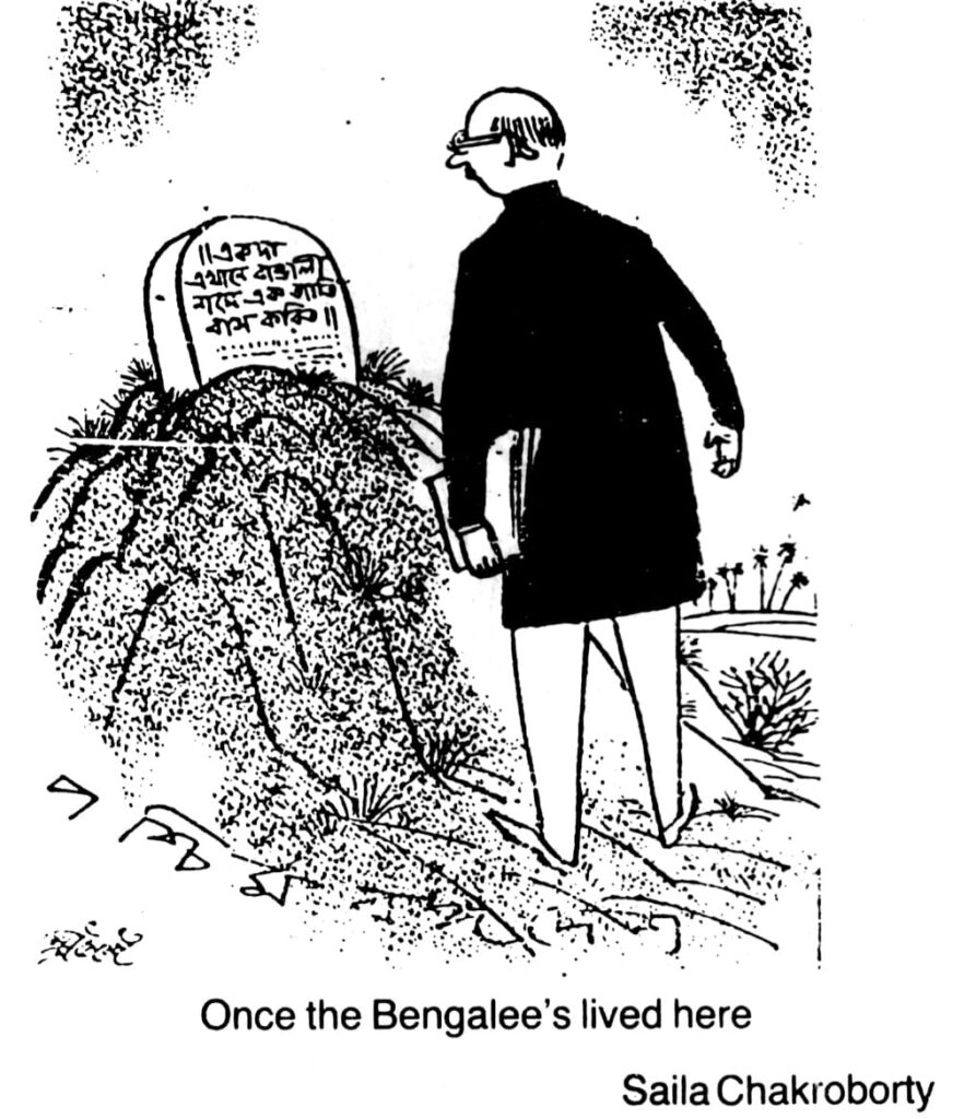 একটি কার্টুনে দেখা যায়, ভবিষ্যৎ পশ্চিমবঙ্গের একটি পূর্বাভাস, যেখানে এক গবেষক দাঁড়িয়ে রয়েছেন, আর তার সামনে একটি সমাধিপ্রস্তরে লেখা রয়েছে,‘একদা এখানে বাঙ্গালী নামে একটি জাতি বাস করত।’
