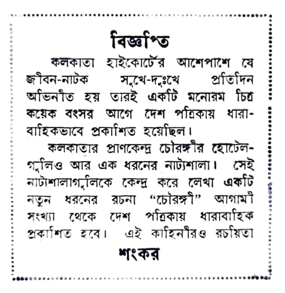 ধরা যাক ‘চৌরঙ্গী’-র কথাই। বহিরাগত মধ্যবিত্ত কথকের চোখের সামনে উন্মোচিত হচ্ছে সাহেবি কলকাতার রহস্য। জালের মতো বুননে সাদারল্যান্ড, রোজি-উইলিয়াম, স্যাটা বোস, করবী গুহ বা মার্কোপোলো চরিত্রগুলির প্রেম-বিরহ-বিচ্ছেদ-বেদনার আলাদা-আলাদা গল্প, কেন্দ্রীয় আকর্ষণ কনির স্ট্রিপটিজে কলকাতার উচ্ছন্নে যাওয়া নিশিজীবন। সমকালীন কলকাতার এইসব পরতে বাস্তবেও তো রয়েছে মিস শেফালিদের না-বলা গল্প। গিমিক বলতেই পারেন। কিন্তু এসব চমৎকৃতির আড়ালেও তো থাকে কলকাতার চালচিত্র বদলের সমাজ-ইতিহাস, সাহেবদের থেকে সংস্কৃতির ব্যাটন অবাঙালি ব্যাবসায়ীদের কাছে হস্তান্তরের গল্প। প্রতিদ্বন্দ্বীতায় ক্রমশ পিছিয়ে পড়তে থাকা বাঙালি, সামাজিক নিরাপত্তাহীনতা থেকে পরের দশকে একটা চাকরির জন্য যে কোথায় নেমে যাবে, তা ‘সীমাবদ্ধ’, ‘জন-অরণ্য’, ‘তীরন্দাজ’ অবধি সহজেই পড়ে ফেলা যায় শংকর-এর লেখায়।