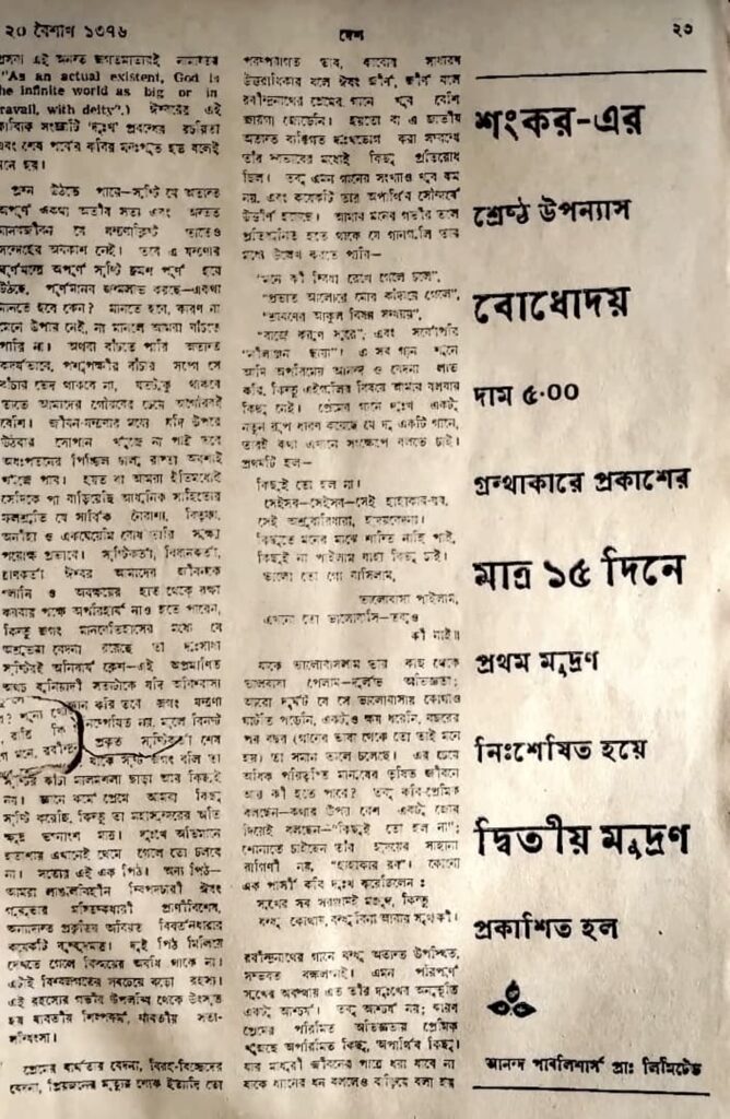‘পুতুল নাচের ইতিকথা’য় কে জানতে চায় শশীর ডাক্তারিবিদ্যের বহর, ডাক্তারখানার অর্থনীতি অথবা তার পেশাগত রাজনীতির মাত্রা? কিন্তু সংখ্যাগরিষ্ঠ পাঠক ‘এ জীবন লইয়া কী করিব?’— আদি কোনও মৌল প্রশ্নের উত্তরসাধনায় উপন্যাসে অভিনিবেশ করেন না, তাঁদের বাসনা একটি সহজ জীবনদর্শনকে কাহিনিতে খুঁজে পাওয়া; কিছুক্ষেত্রে আরেক ধাপ এগিয়ে, নিজের জানা-বোঝাকে কাহিনির প্রতিফলিত আদর্শ দিয়ে প্রত্যয়িত করিয়ে নেওয়া। সুধীন্দ্রনাথ দত্ত তো সেই কবেই বলেছিলেন, বাংলা উপন্যাসের পৃষ্ঠপোষক ‘প্রাক চল্লিশ ডেলি-প্যাসেঞ্জার’ ও ‘উত্তর চল্লিশ পৌরস্ত্রী’। পুরনাগরিক পাঠককে গুরুত্ব এবং প্রকাশককে ব্যাবসা দেওয়া শংকরের মতো লেখকদের বিদ্যাচর্চার পরিসর অপরায়িত করবে, শুধুই ‘বেস্টসেলার-লিখিয়ে’ তকমায় চিনতে চাইবে তাতে আশ্চর্যের কী?