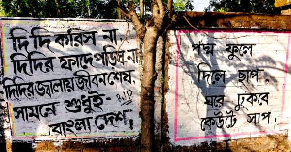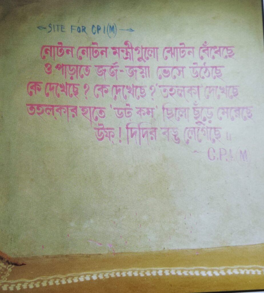 দলের গতিপ্রকৃতির সঙ্গে-সঙ্গে দেওয়াল লিখনের পরিবর্তনও চোখে পড়ে। ২০০১-এ, তৃণমূলের স্লোগান ছিল,‘উল্টে দিন/পাল্টে দিন’। ২০০৬-এ, তৃণমূলের স্লোগান ছিল, ‘চুপচাপ/ফুলে ছাপ’। বিশ বছর বাদ, সিপিআইএমের পক্ষ থেকে আহ্বান, ‘চুপচাপ ইভিএমে/ সব ভোট সিপিয়েমে’।