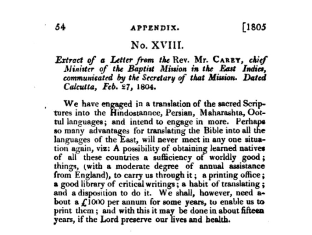 সারা পৃথিবীতে সকল সম্প্রদায়ের মানুষের হাতে খ্রিস্টিয় ধর্মগ্রন্থ ও অনুদিত বাইবেল তুলে দেওয়ার লক্ষ্যে ব্রিটিশ ও মার্কিন বাইবেল সোসাইটি স্থাপিত হয় ১৮০৪ সালে। তাঁরা নিজেরা অনুবাদ করবেন, আর যেখানে আগের থেকেই অনুবাদের কাজ চালু হয়ে গেছে, সেখানে তাঁরা আর্থিক সহযোগিতা করবেন। এ-বিষয়ে তাঁরা একটি বিজ্ঞাপন দেন, এবং থিতু হয়ে বসতে না বসতেই, সেখানে একটি চিঠি পৌঁছয় বাংলায় বাইবেল ছাপার জন্য ১০০০ পাউন্ড প্রার্থনা করে। তাদের প্রথম রিপোর্টের সূচিতেই তাদের বিস্ময় স্পষ্টঃ A correspondence has been opened by your Committee, with some gentleman at Fort William in Bengal, and that the plan and regulation of the Society have been communicated to him. ইনি আর কেউ নন, উইলিয়াম কেরি। যিনি জানতেন এসব ক্ষেত্রে বিলম্ব হলে টাকা পাওয়া শুধু কঠিন নয়, কখনও-কখনও অসম্ভব হয়ে পড়ে। সোসাইটির ১৮০৭ সালের রিপোর্টে দেখা যাচ্ছে যে— কেরির চটজলদি রেসপন্সে খুশি হয়ে তাঁরা পাঁচটি ভারতীয় ভাষায় বাইবেল অনুবাদ বাবদ কেরীকে ১০০০ পাউন্ড অগ্রিম দেন এবং একটি লাইব্রেরী গড়ে তোলার, স্থানীয় সহকারীদের মাইনে দেওয়ার আর ছাপানোর বিবিধ খরচ বাবদ আরও বোনাস ১০০০ পাউন্ড মঞ্জুর করেন। স্পষ্টত, ফোর্ট উইলিয়মের মতো একটি সরকারী প্রতিষ্ঠানের মাধ্যমে আবেদনটি যাওয়ায়, তাঁরা আরও স্বতঃস্ফূর্ত ভাবে অনুদানটি দেয়। শীঘ্রই ফোর্ট উইলিয়মে কেরীকে সদস্য রেখে একটি কমিটি তৈরি হয়, টাকাটির ব্যবহার তদারকি করার জন্য। এতে ফোর্ট উইলিয়মে একরকম সমস্যা হয় যদিও। আগে সেই গল্পটা করে নেওয়া যাক।