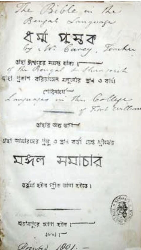 ১৮০০ সালে বড়লাট ওয়েলেসলি ফোর্ট উইলিয়ম কলেজ পত্তন করেন এদেশে আসা সাহেব অফিসারদের দেশি ভাষায় পটু করে তোলার জন্য। সেটি ভাষা চর্চার গুরুত্বপূর্ণ কেন্দ্র হয়ে ওঠে একইসঙ্গে বিতর্কেরও। যখন বাইবেল অনুবাদের খানিকটা উদ্যোগ নেওয়া হয়, তখন ভারতীয় শিক্ষকদের একাংশ প্রতিবাদী হয়ে ওঠেন। কেন সরকারী টাকায় সরকারী পরিসরে ধর্ম-প্রচারমূলক কাজ হবে এই নিয়ে। কর্তৃপক্ষ শঙ্কিত হন এই ঝামেলায় আসল কাজ, অর্থাৎ প্রশাসকদের ভাষা শিক্ষার কাজ না ডকে ওঠে। অতএব উদ্যোগটি ধামাচাপা পড়ে যায়। পরে ব্যবস্থাটি এরকম দাঁড়ায় যে— বাইবেল অনুবাদ করবে শ্রীরামপুর প্রেস, আর বাইবেল সোসাইটির অনুদান পর্যবেক্ষণ করবে ফোর্ট উইলিয়মস্থিত একটি কমিটি। আর কেরি এই দুইয়ের মধ্যে যোগাযোগ-সূত্র হিসাবে থাকবেন। স্পষ্টতই, প্রথম দিকে বাইবেল সোসাইটির কাজ ছিল সাহায্য ও সমর্থনের। সরাসরি অনুবাদের কাজে তাঁরা শ্রীরামপুরত্রয়ীর ওপরেই নির্ভরশীল ছিল। তবে এই অবস্থা পালটাতে সময় লাগেনি বেশি। বাইবেল সোসাইটির প্রাথমিক কেরি নির্ভরতার একটা কারণ সম্ভবত এই ছিল যে, ১৮১৩ পর্যন্ত ব্রিটিশ শাসনাধীন ভারতে মিশনারি ক্রিয়াকলাপ শুধু যে অনভিপ্রেত ছিল তা নয়, রীতিমতো বেআইনি ছিল।