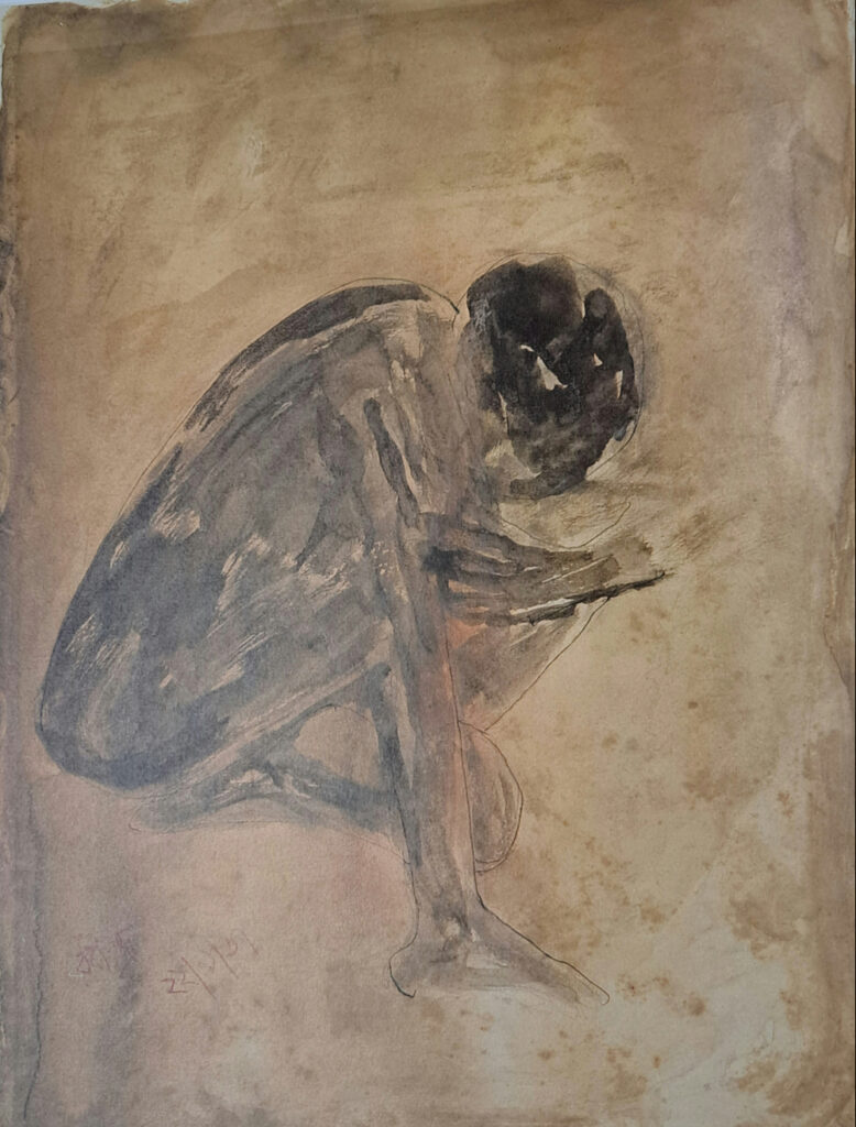 উনিশশো চৌত্রিশ-পঁয়ত্রিশে আঁকা একটি কালো কালির ছবিতে ব্রাশের পুরু রেখা ত্বরিত গতিতে তৈরি করেছে একজন মধ্যবয়স্ক পুরুষের নগ্নমূর্তি, যা বসে আছে রঁদ্যার ‘দ্য থিঙ্কার’-এর ভঙ্গিতে। উনিশশো সাঁইত্রিশের আঁকা আরেকটি রঙিন কালি আর জলরঙের ছবিতে একজন যুবতী নারী নগ্ন হয়ে বসে আছেন মাথা নীচু করে, লজ্জায় কিংবা বিষাদে। উনিশশো সাঁয়ত্রিশের আরেকটি রঙিন কালি, পোস্টার রং আর প্যাস্টেলে আঁকা ছবিতে আড়াআড়ি দাঁড়িয়ে আছেন একজন নগ্ন পুরুষ। এই ছবি যেন নিজেকে নিয়ে কৌতুক, নিজের শরীরকে অতিপ্রাকৃত করে সৃষ্টির জগৎটাকেই উপহাস করা। মৃত্যুর দু’বছর আগেই ১৯৩৯-এ রবীন্দ্রনাথ এঁকেছেন নিজেকেই নগ্ন করে, যেন এক বিধ্বস্ত ভাঙাচোরা মানুষ! এই প্রসঙ্গে সংগীতশিল্পী শান্তিদেব ঘোষের একটি ব্যক্তিগত অভিজ্ঞতা আমাদের এইসব ছবির মর্মের কিছুটা হয়তো ইঙ্গিত দেবে। ১৯৩৭ সালের ১০ সেপ্টেম্বর। অসুস্থ রবীন্দ্রনাথ অচেতন হয়ে শুয়ে আছেন। রাতে গুরুদেবকে দেখাশোনার দায়িত্বে রয়েছেন আরও কয়েকজনের সঙ্গে শান্তিদেব। হঠাৎ রাতে এক সময়ে তিনি দেখলেন যে রবীন্দ্রনাথ খাটের এক পাশে নেমে সম্পূর্ণ নগ্ন অবস্থায় দাঁড়িয়ে। তাঁর মনে হল, সামনে যেন একজন জ্যোতির্ময় পুরুষ দাঁড়িয়ে আছেন। রবীন্দ্রনাথের নিজের এই নগ্নতার মধ্যে দিয়ে সমস্ত বিশ্বপ্রকৃতি যেন উঠে এসেছে। সৃষ্টির চূড়ান্তে পৌঁছেও নিজেকে এইরকম ভাঙচুর, এইরকম উন্মোচন রবীন্দ্রনাথই একমাত্র করতে পারেন।