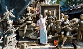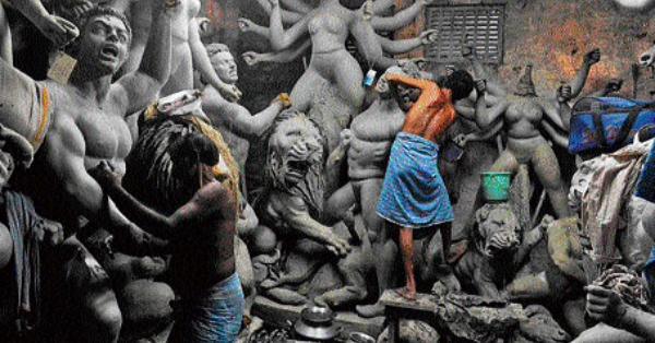 মাটি মাখার কাজ যাঁরা করতেন, তাঁরা আবার আরেকটা কর্মে নিজেদের দক্ষ করে তুললেন। আশ্চর্য সেই কাজের নাম। ‘মরা ধরা’। না মরা মানুষ ধরা তার কাজ নয় তার কাজ হল ভেজা মাটি মরে গিয়ে কোন মাপে মূর্তিকে নিয়ে আসে, তা নিখুঁত ভাবে হিসেব করা। সে জানে, যদি কোনও বাড়িতে দুর্গা কুড়ি হাত বানাতে হয় তাহলে একুশ বা বাইশ হাত পর্যন্ত মাটি গড়তে হবে। তারপর শুকিয়ে গিয়ে সেটা কুড়ি হাতে আসবে। এই শুকিয়ে যাওয়ার অঙ্কটাই কুমোরপাড়ায় ‘মরা ধরা’ নামে পরিচিত। এভাবেই চলতে থাকে বাঙালির যাপন। সেই যাপনের সূত্র ধরেই সে দুর্গার নানা কথা বলে সকলের কাছে। এই যেমন চালচিত্রের শিল্পী যখন শিবের ছবি আঁকেন, তখন তিনি দেখান যে, একাকী গৃহে শিব বসে তানপুরা বাজাচ্ছেন। এই যে তাঁর ঘরণী বাপের বাড়ি চলে গিয়েছেন, তখন শিবের একাকিত্ব ধরে রাখলেন বাংলার চালচিত্র শিল্পী।