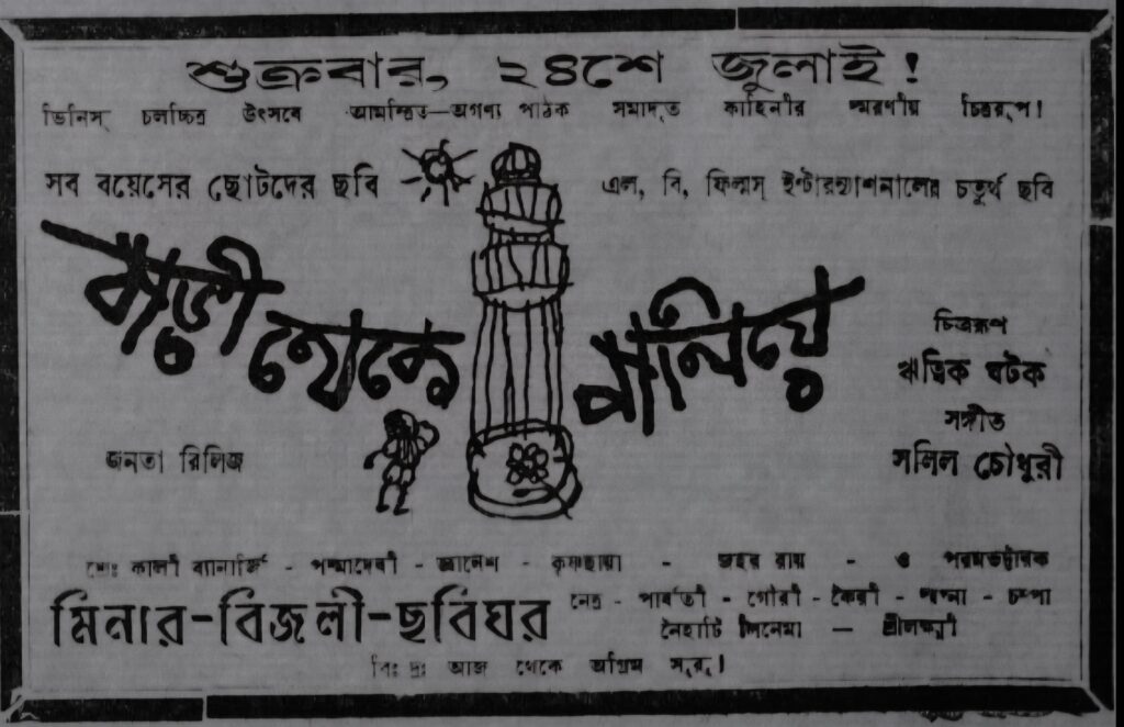 ২০০৭ সাল। প্রেসিডেন্সি কলেজ চলচ্চিত্র সংসদের উদ্যোগে ঋত্বিক ঘটকের ‘যুক্তি তক্কো আর গপ্পো’ দেখানো হবে। ডিরোজিও অডিটোরিয়াম অর্ধেক খালি, আশাবাদী চোখে অর্ধেক ভর্তি। সংস্থার নবীন উদ্যোক্তাদের তরফে কয়েকটি আশাবাদী বাতচিতের পর হল অন্ধকার করে দেওয়া হল। সিনেমা চলতে আরম্ভ করল। কিন্তু এ কী! এল বি ফিল্ম ইন্টারন্যাশনালের ব্যানার কেন? নৌকো চড়া বাচ্চার ছবি দেখা যাচ্ছে কেন? সব্বনাশ! পাশ থেকে লাফিয়ে উঠে মঞ্চের পিছনে গেলেন এক তরুণ। তড়িঘড়ি সব বন্ধ-টন্ধ করে আবার নতুন করে চলতে আরম্ভ করল পূর্বঘোষিত সিনেমা। হলে ততক্ষণে উসখুস শুরু হয়েছে, ওটা কোন সিনেমা ছিল? ওটাও দেখব! না না, ওটা ছোটদের সিনেমা। ঋত্বিক দেখতে হলে ‘সুবর্ণরেখা’ দেখো, ‘যুক্তি তক্কো…’ দেখো, ‘কোমল গান্ধার’, অন্তত ‘মেঘে ঢাকা তারা’। কলেজের সিনেমাদাদারা সকলে বোধহয় বুঝতে পারেননি যে, ১৯৬০ থেকে যে পার্টিশন-ট্রিলজি শুরু হয়েছিল, ‘বাড়ী থেকে পালিয়ে’ তার ভূমিকা।