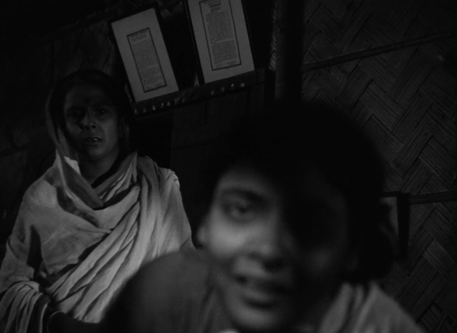 আবার কোথাও একটা ফ্রেমে একাধিক চরিত্রের অবস্থান, সেখানে তাদের মানসিক অবস্থা ও গতির সাযুজ্য গঠন করা হচ্ছে শুধুমাত্র ক্যামেরার ফোকাস স্থির রেখে। ‘মেঘে ঢাকা তারা’-য় নীতা যখন জানতে পারল তার যক্ষ্মা হয়েছে, সে ভেতর বাড়ি ছেড়ে বাইরের ঘরে আশ্রয় নিল। সে একেবারে ক্যামেরার সামনে উপুড় হয়ে শুয়ে কাশছে, এমন সময়ে তার মা এসে যখন বোম্বাইয়ে শঙ্করের সুখ্যাতির কথাগুলো বলতে শুরু করে, তখন নীতা কাশির দমকগুলোকে লুকোতে থাকে। মা প্রশ্ন করে — ‘হয়েচে টা কী? অ্যাঁ, রাতদুপুরে বাইর-বাড়িতে এয়ে বিছানা পাতস’। নীতা চমকে উঠে রক্তভরা কাপড়টা লুকিয়ে উত্তর দেয় — ‘এটা তো একটা নির্বান্ধব পুরী। এইটার আবার বাইর বাড়ি এইটার আবার অন্দর বাড়ি।’