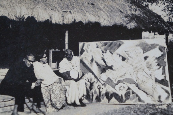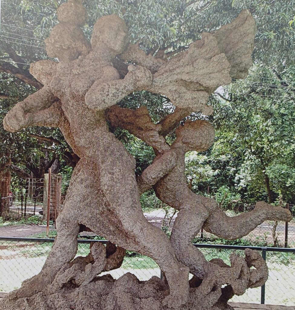 যিনি ক্যামেরা নিয়ে তৈরি, তাঁর চোখের উজ্জ্বল দৃষ্টি নজরে না পড়ে যায় না। শুনলাম সেই ক্ষুরধারদৃষ্টি তরুণের নাম পার্থপ্রতিম চৌধুরী। ওঁর নাম শুনে আবার বিস্ময়! এই সেই ‘শুভা ও দেবতার গ্রাস’, ‘ছায়াসূর্য’-এর মত ছায়াছবির পরিচালক! এমনকী সাতের দশকের গোড়ায় সেই অসামান্য ছবি ‘যদুবংশ’ ইনিই পরিচালনা করেছেন? ভাবতেই পারছি না। তিন দিকপালকে এখানে একসঙ্গে দেখে আমি চমৎকৃত! শুনলাম গত দু’য়েকদিন ধরে রামকিঙ্করকে নিয়ে যে তথ্যচিত্র নির্মাণ করছেন ঋত্বিক, সেই পর্বে ওঁদের আজকের কাজ ‘কলের বাঁশি’ আর ‘সাঁওতাল পরিবার’কে কেন্দ্র করে। (যদিও তথ্যচিত্রে ‘কলের বাঁশি’ স্থাপত্যটিকে উল্লেখ করা হয়েছে ‘কৃষক দম্পতি’ বলে।) ক্যামেরা রেডি, ত্রি-চক্রযানের হাতল তার চালকের বজ্রমুষ্টিতে সঞ্চালিত হওয়ার প্রতীক্ষায়। পার্থপ্রতিমের চোখ ক্যামেরায় নিবদ্ধ, সবাই চুপচাপ। রামকিঙ্করকে একটা জায়গায় দাঁড়াতে বলা হয়েছে, এবারে ধীর পায়ে এগিয়ে এলেন ঋত্বিক। তারপর ভাস্কর্যের দিকে তাকিয়ে তাঁর স্বভাবসিদ্ধ ভঙ্গিতে শিল্পীকে জিজ্ঞাসা করলেন, ‘এটা কী করেছ?’। সুবোধ বালকের মতো মুখে হাসির রেখা টেনে রামকিঙ্কর শোনালেন সেই ভাস্কর্য রচনার নেপথ্য-কাহনি। উপস্থিত সকলেই শুনলাম সেই গল্প। ভারতীয় শিল্পের এক অন্যতম শ্রেষ্ঠ কাজের আড়ালে লুকিয়ে থাকা এক আশ্চর্য উপাখ্যান। আজকের আধুনিক সংজ্ঞায় যাকে বলতে পারি ‘অ্যানেকডোট’, শিল্পসৃষ্টির অন্দরের বিস্তার। কিন্তু কী ছিল শিল্পের সেই গল্প, যা ঋত্বিকের প্রশ্নে রামকিঙ্কর তাঁকে জানালেন?