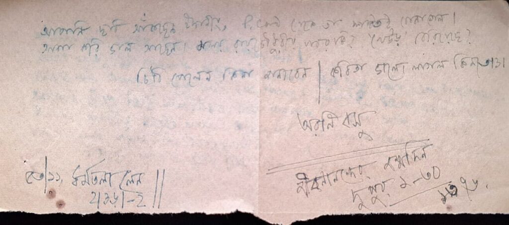 সুবিমলদা, আপনার পাঠানো Post-Card পেয়েছি। আপনি আপনার আস্তানায় যেতে লিখেছেন, কিন্তু এতদূর থেকে আপনার বাড়ী পৌঁছতে পৌঁছতেই নটা বেজে যাবে। আলাপ-আলোচনা-আড্ডার সময় পাওয়া যাবে না।