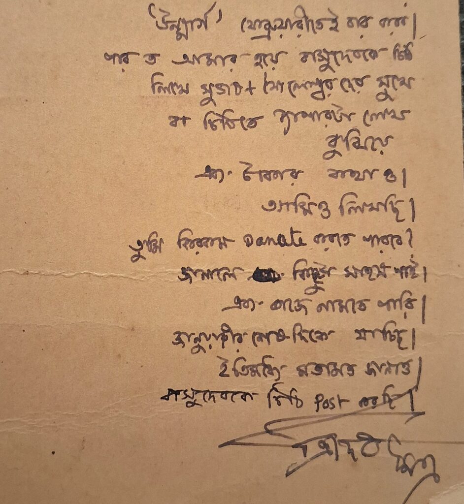 প্রীতি ও সদিচ্ছা রইল। শৈলেশ্বর, সুভাষ, হারাধন সব কেমন আছে— কাজের চাপে সময় করে উঠতে পারছি না ‘কফি হাউস’ যাবার, তাছাড়া যা গলযোগ গেল সে কথা পুনরুক্তির প্রয়োজন নেই বোধহয়। ইত্যাদি ইত্যাদি