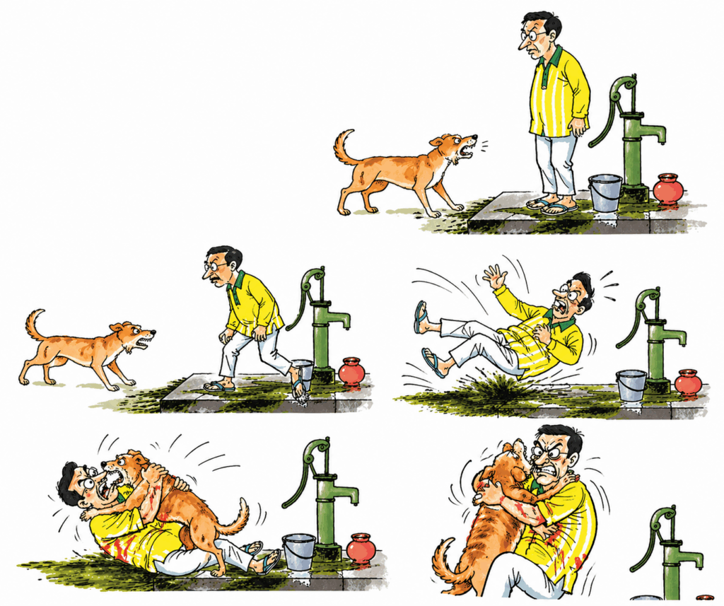 এ-বাড়ির জানালা, ও-বাড়ির বারান্দা থেকে বড়-বড় ফাঁস ঝুলছে। দড়ি দুলছে। শুধু কুকুরটাকে নাগালের মধ্যে পেতে হবে। অনেক বাড়ির ওপরে, ছাদে, লোকজন রেডি থান ইট আর মাটিভরা ফুলের টব নিয়ে। তারা সুযোগ বুঝে দু-একবার ছাদ থেকে ফেলেওছে কিন্তু ততক্ষণে কুকুরটি তার স্থান পরিবর্তন করে চলে গেছে। মণ্ডল দিদা রোজ দু’বেলা কুকুরদের ডেকে ডেকে খাওয়ান। সব কুকুরই তাঁর চেনা। তিনিও একবার চেষ্টা করলেন— খাবার নিয়ে। তাঁর সুরেলা ডাকা অগ্রাহ্য করে কুকুরটা তেড়ে গেল। মণ্ডলদিদা কামড় খেলেন। অবস্থা ঘোরালো!