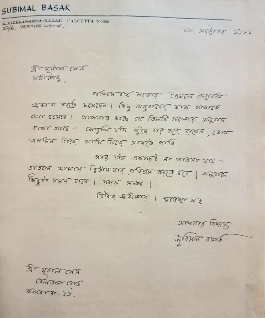 মৃণাল সেন সুবিমল-অনূদিত প্রেমচন্দের তিনটি গল্প চেয়ে নিয়েছিলেন— কেন, তার কারণ অজানা। তবে ইতিমধ্যে বেশ কয়েকবার মৃণালের সঙ্গে তাঁর ফোন-মারফত কথা হয়েছিল; সম্ভবত তখনই চেয়ে থাকবেন গল্পগুলি। সুবিমল গল্পগুলি ফেরত চেয়ে যে-চিঠি দিয়েছিলেন, তার খসড়া খুঁজে পেয়েছি আমরা—