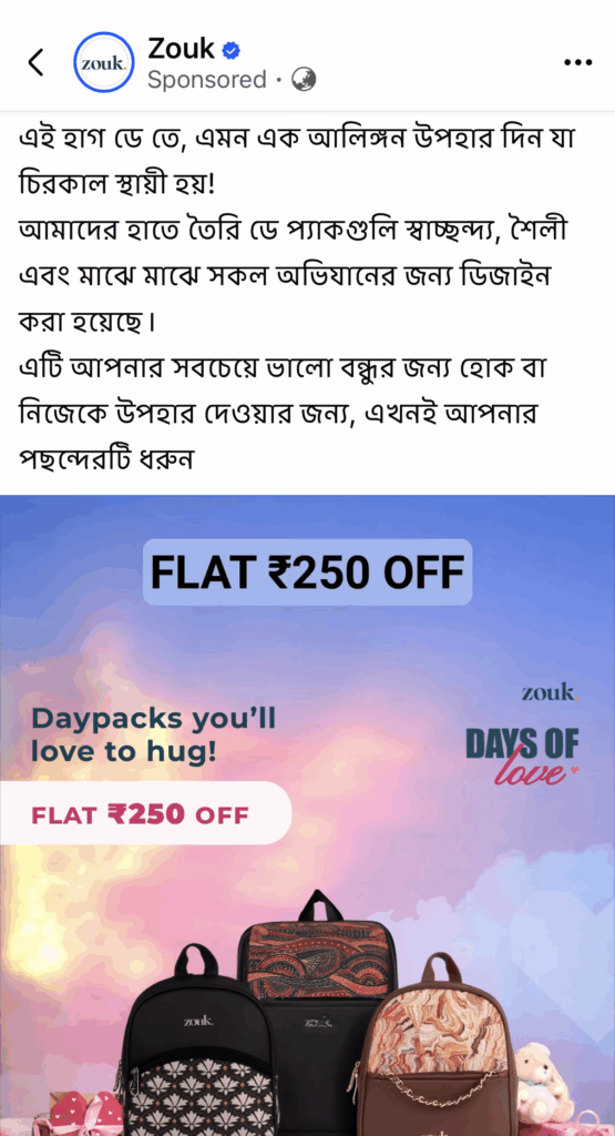 সামাজিক মাধ্যমের বিজ্ঞাপনে এই অবস্থার কারণ মূলত প্রযুক্তি। কোনও মানুষ অন্য ভাষা থেকে অনুবাদ করছেন না। কৃত্রিম বুদ্ধিমত্তার সাহায্যে, অনুবাদ করছে মেশিন। ঢুকছে ইংরেজি। প্রসব হচ্ছে ভয়ংকর বাংলা। সামাজিক মাধ্যমে কোনও ‘ডায়নামিক ক্রিয়েটিভ’ বা ‘প্রোগ্রাম’ করা বিজ্ঞাপন অথবা ‘ক্যাটালগ’-জাতীয় বিজ্ঞাপন প্রকাশিত হলে ‘মেটা’ সম্ভাব্য ভোক্তার ভৌগোলিক অবস্থান, স্থানীয় আচার-ব্যবহার, সাধারণ কথ্যভাষার আধিপত্যর ধরন ইত্যাদি খুঁজে নিয়ে নিজেই অনুবাদ করে দেয় সেটা। বিশেষ করে ‘ফেসবুক’ বা ‘ইনস্টাগ্রাম’-এর ‘ফিড’ ভোক্তার আঞ্চলিক অবস্থান বুঝে সেইভাবে তৈরি করে দেয় নিজেই। বিজ্ঞাপনদাতার নিশানায় যে অঞ্চলের বা সম্প্রদায়ের মানুষ চিহ্নিত হয়েছেন পণ্যের বা পরিষেবার সম্ভাব্য ভোক্তা-র একটা প্রধান অংশ হিসাবে, সেখানে মেটা নিজেই ঠিক করে নেয়, কোন ভাষায়, কীভাবে তাঁদের সঙ্গে কথা বললে কার্যসিদ্ধি হতে পারে। আর তাই, কৃত্রিম বুদ্ধিমত্তার সাহায্যে মেশিনেই তৈরি হয়ে যায় বিজ্ঞাপন। তাতে সাপ-ব্যাঙ যা-ই প্রসব হোক না কেন, কারও কিছুই করার থাকে না।