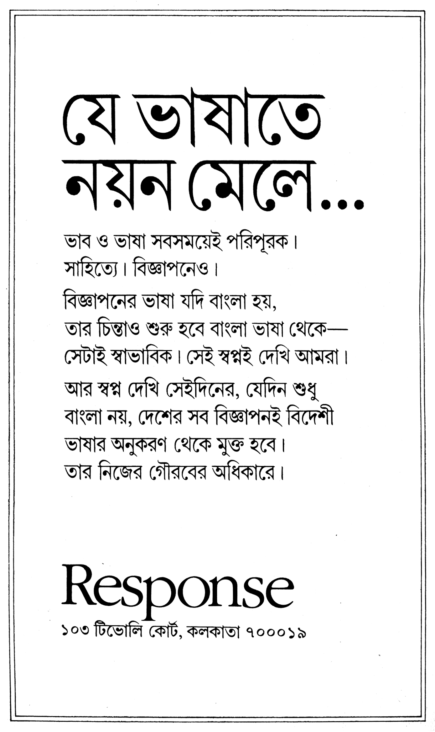 ব্যাপারটা সহজ। তাদের ব্যবসা, ক’জন হাতে গোনা বাংলা বিজ্ঞাপনের পাঠকের ওপর ভর করে চলছে না। বরং, লক্ষ-লক্ষ ইংরেজি বা হিন্দি পড়তে পারেন, বুঝতে পারেন, এ-ধরনের মানুষের ওপরেই তাদের ভরসা। সেই দলে কিন্তু হাজার-হাজার বাঙালিও আছেন। তাহলে বাংলা অনুবাদে সেই একই বিজ্ঞাপন প্রকাশ করার প্রয়োজন? সহজ ব্যাপার। ব্র্যান্ড বড় হলে, ব্র্যান্ডের মিডিয়া প্ল্যানে বাংলা খবরের কাগজ থাকাটা স্বাভাবিক। আবার কেন্দ্রীয় সরকারের বা বিমা সংস্থার বিজ্ঞাপন, সে তো দেশের প্রায় সব ভাষাতেই প্রচারিত হতেই হবে। আর সেই কারণেই বিজ্ঞাপনের মূল ভাষা থেকে অনুবাদ। বহু-সংখ্যক মানুষের (যারা সেই কাগজ নিয়মিত দেখেন/পড়েন) চোখে পড়ানোর জন্যই সেই কাগজে তাঁদের মাতৃভাষায় বিজ্ঞাপন। সেই বিজ্ঞাপনে ছবি আছে। ইংরেজিতে লোগো আছে। ‘ওয়েবসাইট’-এর লিংক, ‘কিউ-আর কোড’, সামাজিক মাধ্যমের পাতার হদিশ ইত্যাদি… সেগুলোও আছে ইংরেজিতে। আর কী চাই? এবার বাংলা শব্দ, বাক্য, বানান ইত্যাদি নিয়ে মাথা না ঘামালেও বেশ ভালই কাজ করবে সেই বিজ্ঞাপন। মোদ্দা কথা, “আমি মাল বা পরিষেবা বেচতে এসেছি ভাই। কিছু জানাতে এসেছি। তাই, যে কাগজ অনেকে পড়ে, সেখানে বিজ্ঞাপন ‘ডেলেছি’। রবিঠাকুর হতে এসেছি থোড়ি? অনেকেই তো বুঝতে পারছে। মাতৃভাষার ওপর যদি এতই প্রেম আপনার, তো ‘বই’ লিখুন না। আমাদের ব্র্যান্ড বা পরিষেবা কিনে কী লাভ?”